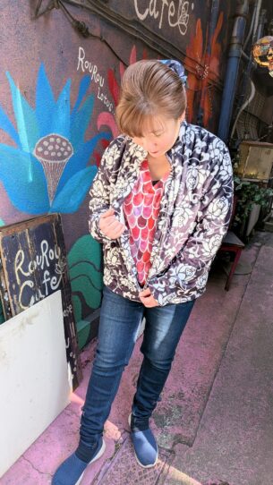 赤ウロコのワンピースに羽織りました。モノトーンの静寂に、熱を灯す赤ウロコ!